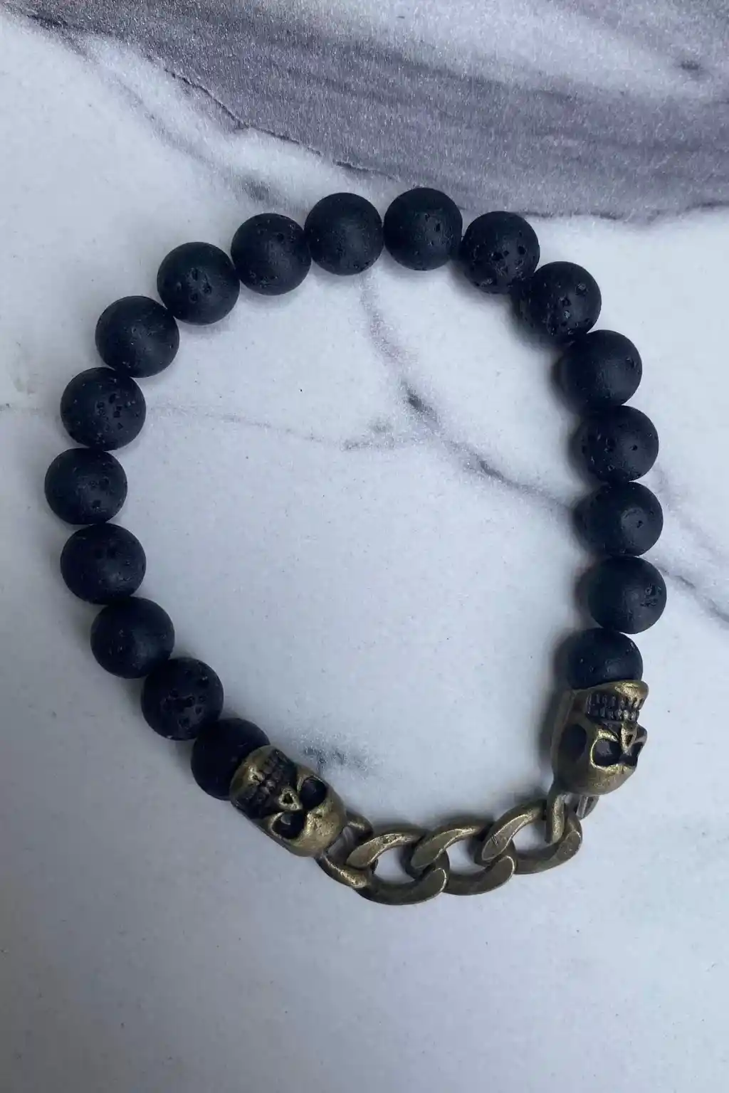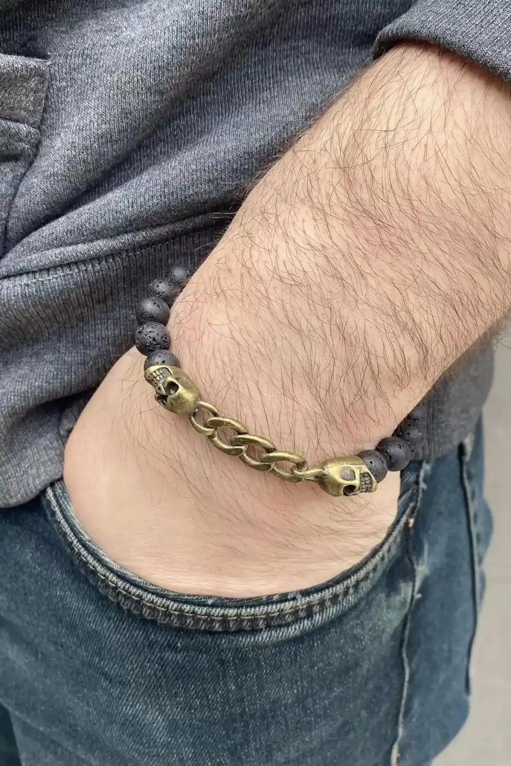 - Siyah renk tasarımıyla şıklığı ve asaleti bileğinizde taşıyın.; - Kurukafa figürleriyle dikkat çekici bir stil oluşturun.; - Taş detayları ile göz alıcı bir parlaklık ve sofistike bir görünüm kazandırın.; - Erkek bileklik, günlük kullanım için ideal konfor ve dayanıklılık sunar.