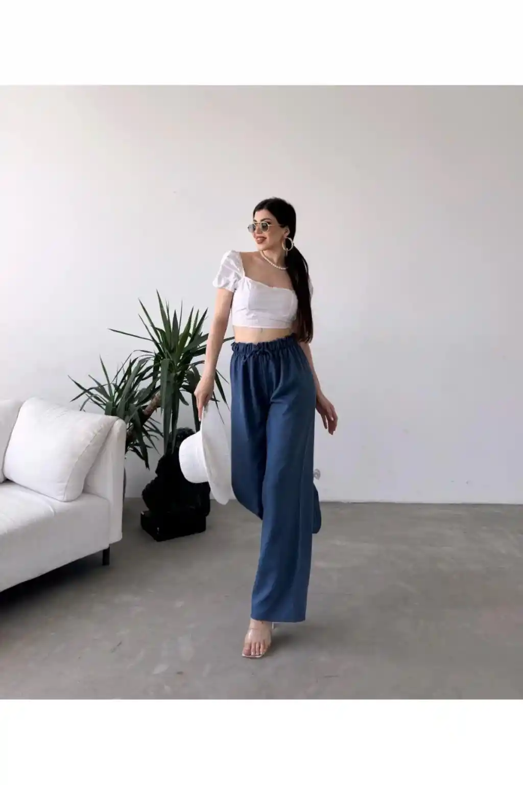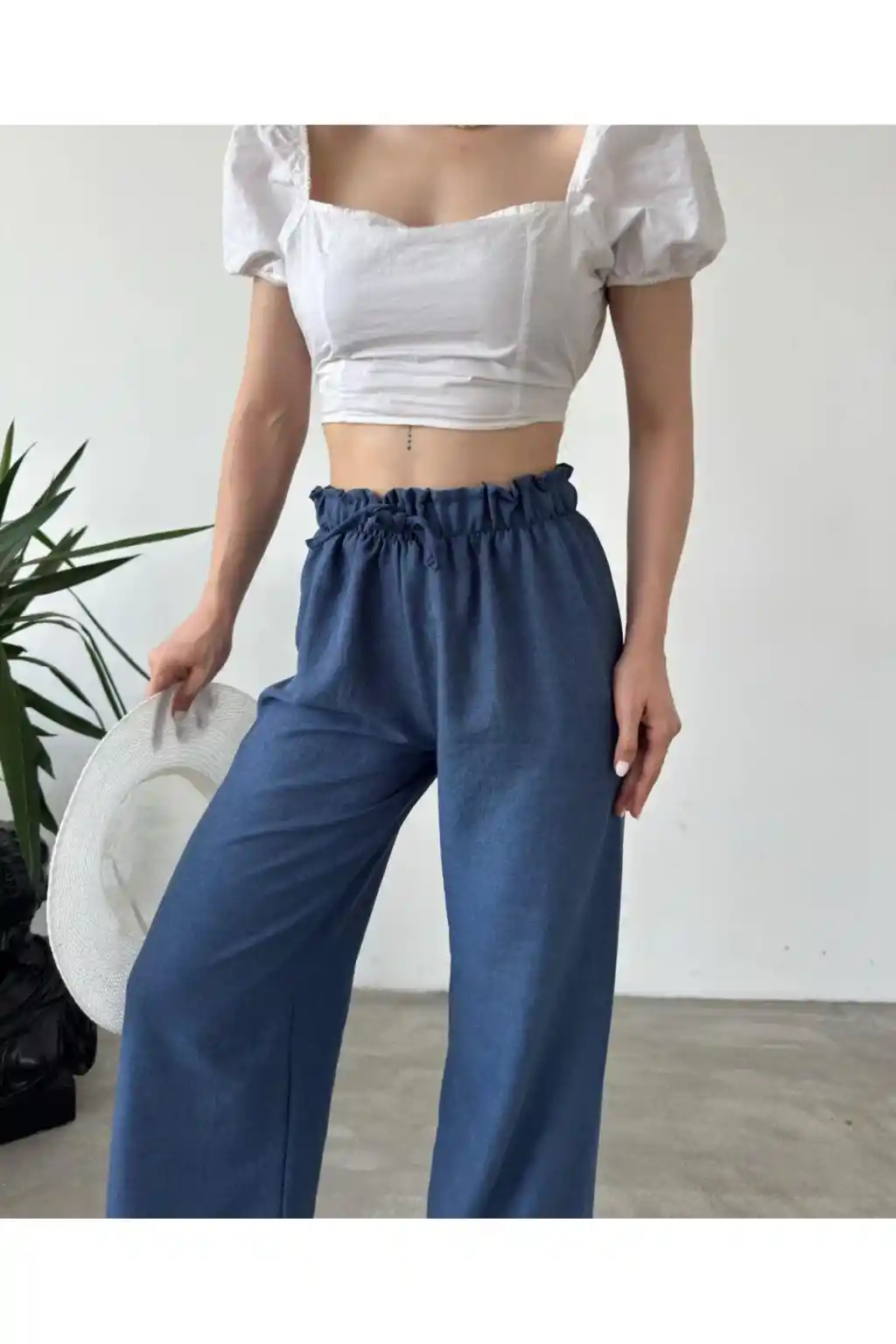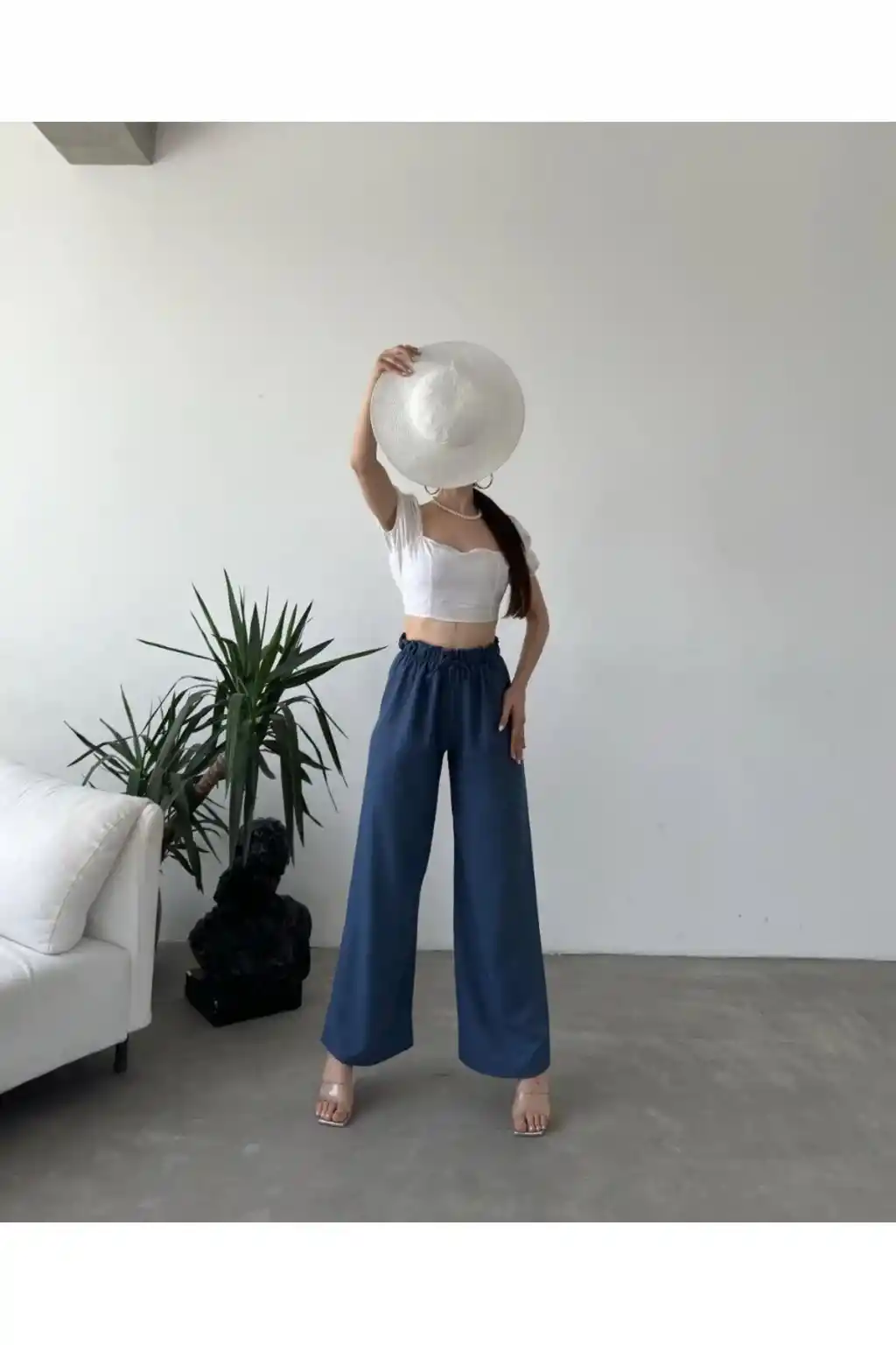- Yüksek bel tasarımı ile modern ve şık bir görünüm sunar.; - Dokuma kumaşı sayesinde dayanıklılığı artırılmıştır ve uzun süreli kullanım için idealdir.; - İndigo rengiyle kolayca kombinlenebilecek çok yönlü bir seçenektir.; - Geniş paça kesimi rahat hareket etme özgürlüğü sağlar ve geniş siluetiyle trend bir görünüm kazandırır.; - Pamuklu materyali cildinizle dosttur ve nefes alabilir yapıdadır, gün boyu konfor sunar.; - Astarsız yapısıyla hafif ve serin tutar; mevsim geçişlerinde idealdir.; - Dokulu dokusuyla göz alıcı detaylara sahip olup, casual giyimde de tercih edilebilir.; - Kemersiz tasarımı sayesinde farklı stiller yaratma imkanı tanır; kişisel zevkinize göre ayarlama yapmanız mümkündür.; - Casual ortamlarda günlük kullanım için uygundur; işlevsellik ve stil arasında mükemmel denge kurar.; - Yıkama talimatlarına uygun bakım ile ürününüz ilk günkü gibi kalacaktır.; - Sürdürülebilirlik detayının bulunmamasına rağmen, yüksek kaliteli malzemelerden üretilmiştir.