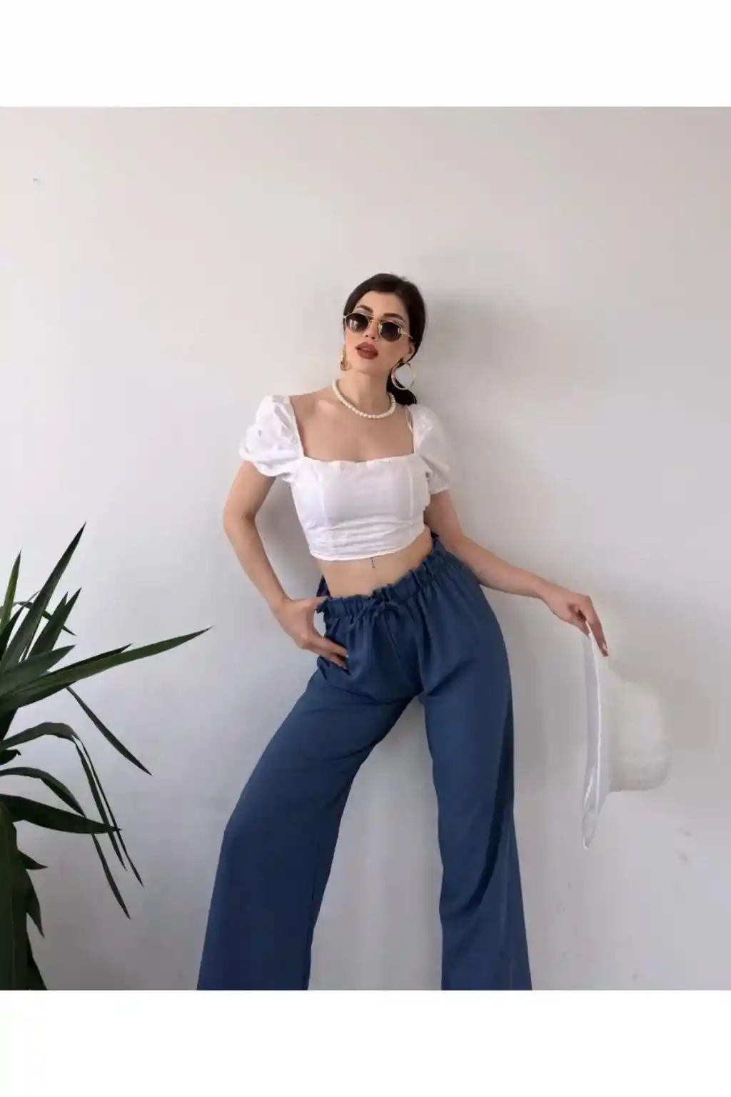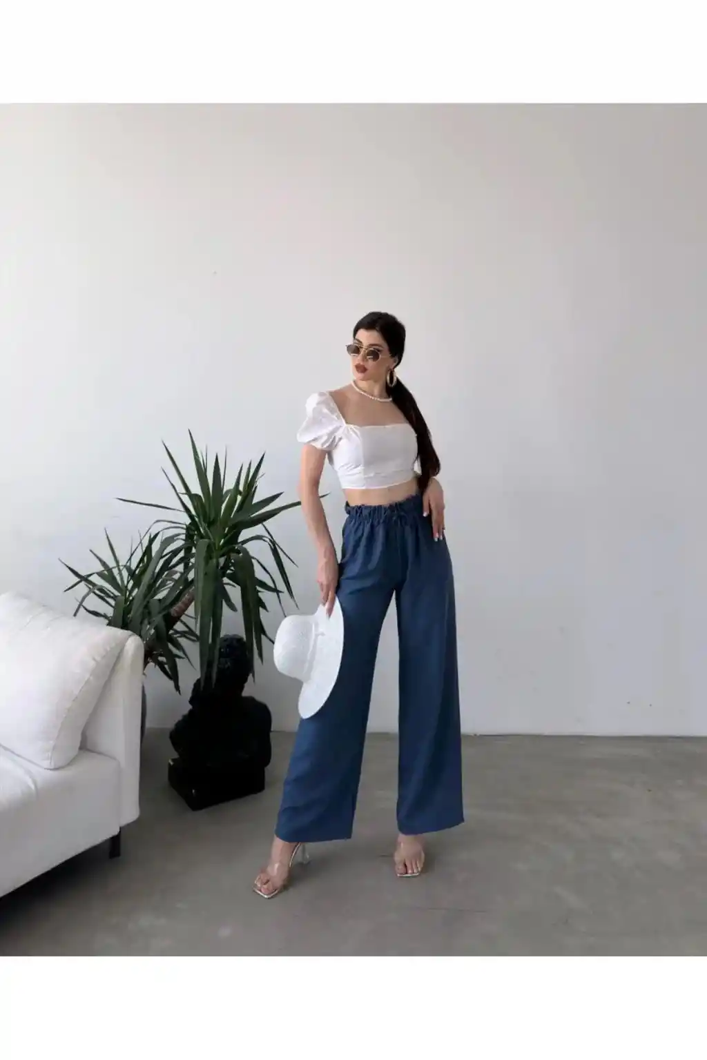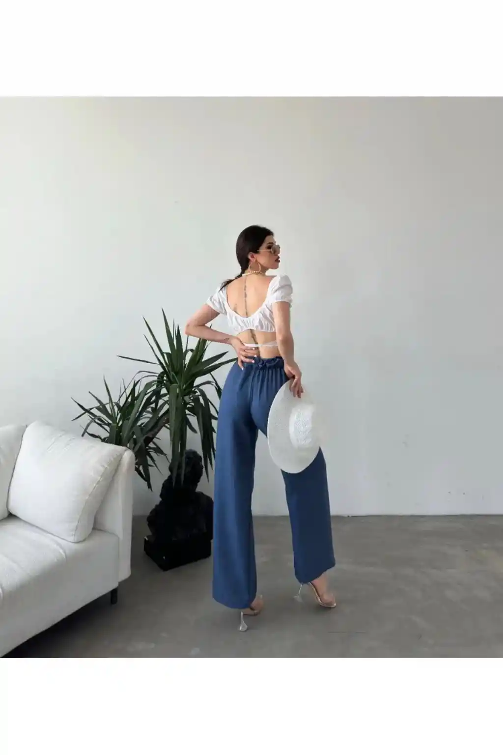 - Yüksek bel tasarımı ile modern ve şık bir görünüm sunar.; - Dokuma kumaşı sayesinde dayanıklılığı artırılmıştır ve uzun süreli kullanım için idealdir.; - İndigo rengiyle kolayca kombinlenebilecek çok yönlü bir seçenektir.; - Geniş paça kesimi rahat hareket etme özgürlüğü sağlar ve geniş siluetiyle trend bir görünüm kazandırır.; - Pamuklu materyali cildinizle dosttur ve nefes alabilir yapıdadır, gün boyu konfor sunar.; - Astarsız yapısıyla hafif ve serin tutar; mevsim geçişlerinde idealdir.; - Dokulu dokusuyla göz alıcı detaylara sahip olup, casual giyimde de tercih edilebilir.; - Kemersiz tasarımı sayesinde farklı stiller yaratma imkanı tanır; kişisel zevkinize göre ayarlama yapmanız mümkündür.; - Casual ortamlarda günlük kullanım için uygundur; işlevsellik ve stil arasında mükemmel denge kurar.; - Yıkama talimatlarına uygun bakım ile ürününüz ilk günkü gibi kalacaktır.; - Sürdürülebilirlik detayının bulunmamasına rağmen, yüksek kaliteli malzemelerden üretilmiştir.